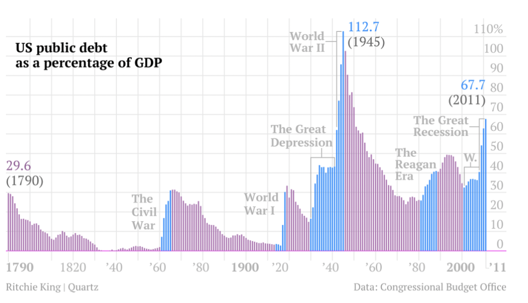 Historically, government debt levels would rise during national emergencies, like wars and economic calamities. Borrowing was deemed necessary and patriotic in these instances. Following these emergencies, the government made strong efforts to reduce the debt as a percentage of GDP.